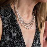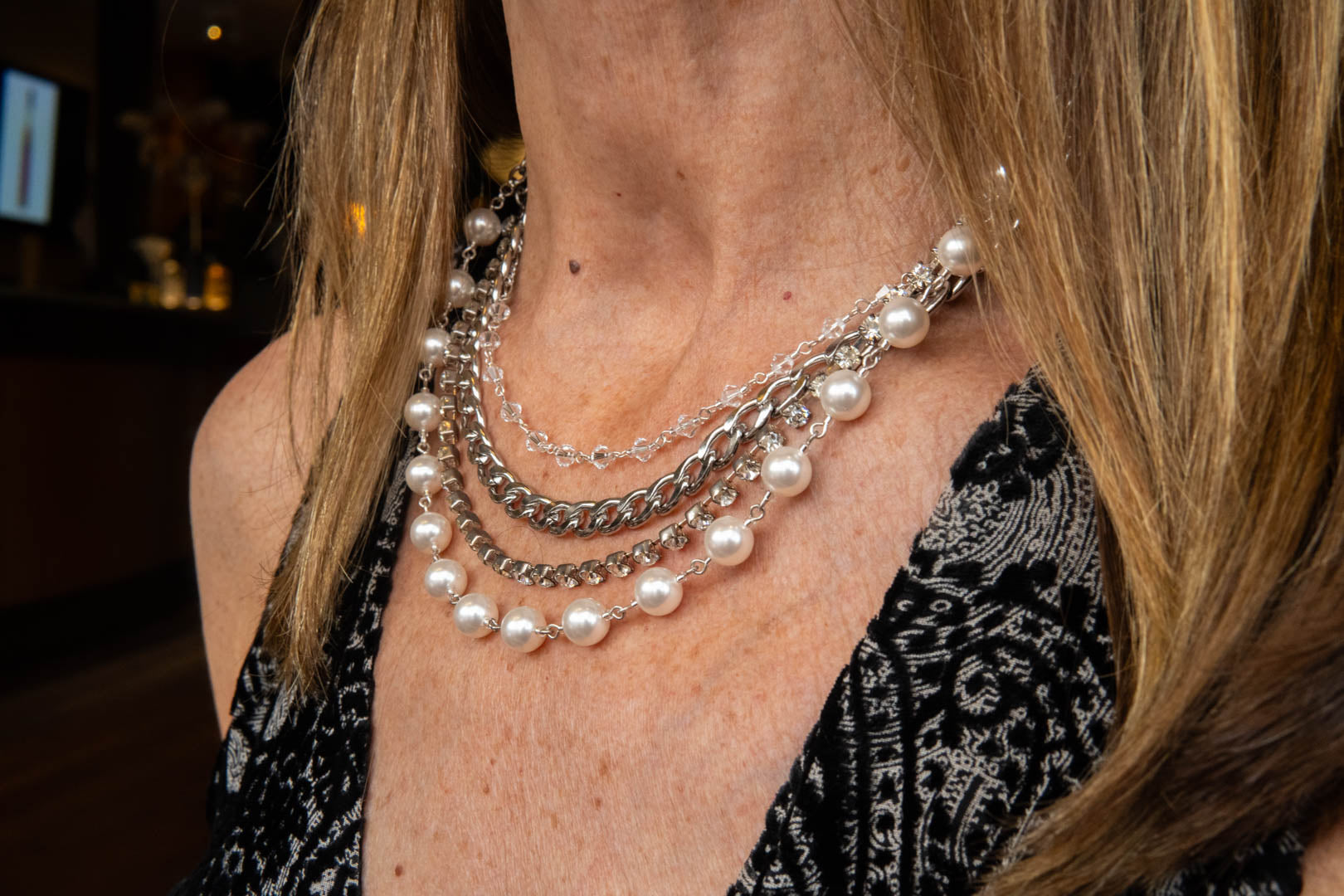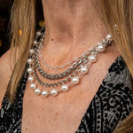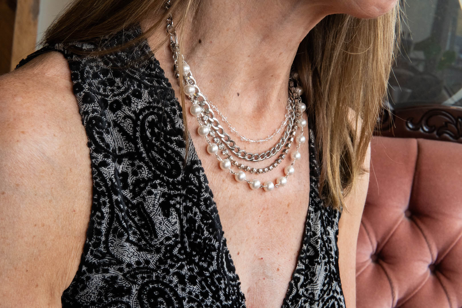 Woman wearing a silver and European crystal and crystal pearl necklace