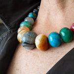 Inspired by our quick selling Breanna, our Meredith features a stunning kaleidoscope of coloured agate! This one-of-a-kind set features a gorgeous agate, amethyst, and rose quartz statement necklace and matching earrings, and is the perfect way to make a bold and stylish statement. Elevate your look and stand out from the crowd with this must-have set!