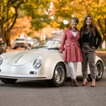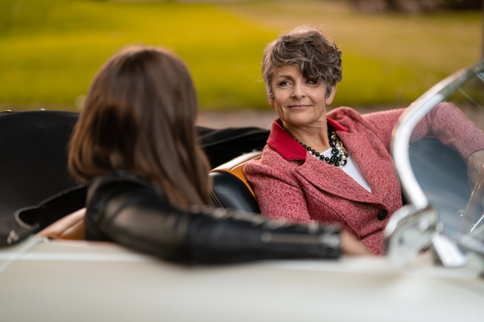 A woman in a car wearing a Carolily Finery statement necklace made from onyx, Swaorvski crystal, gold plated chains and pearls