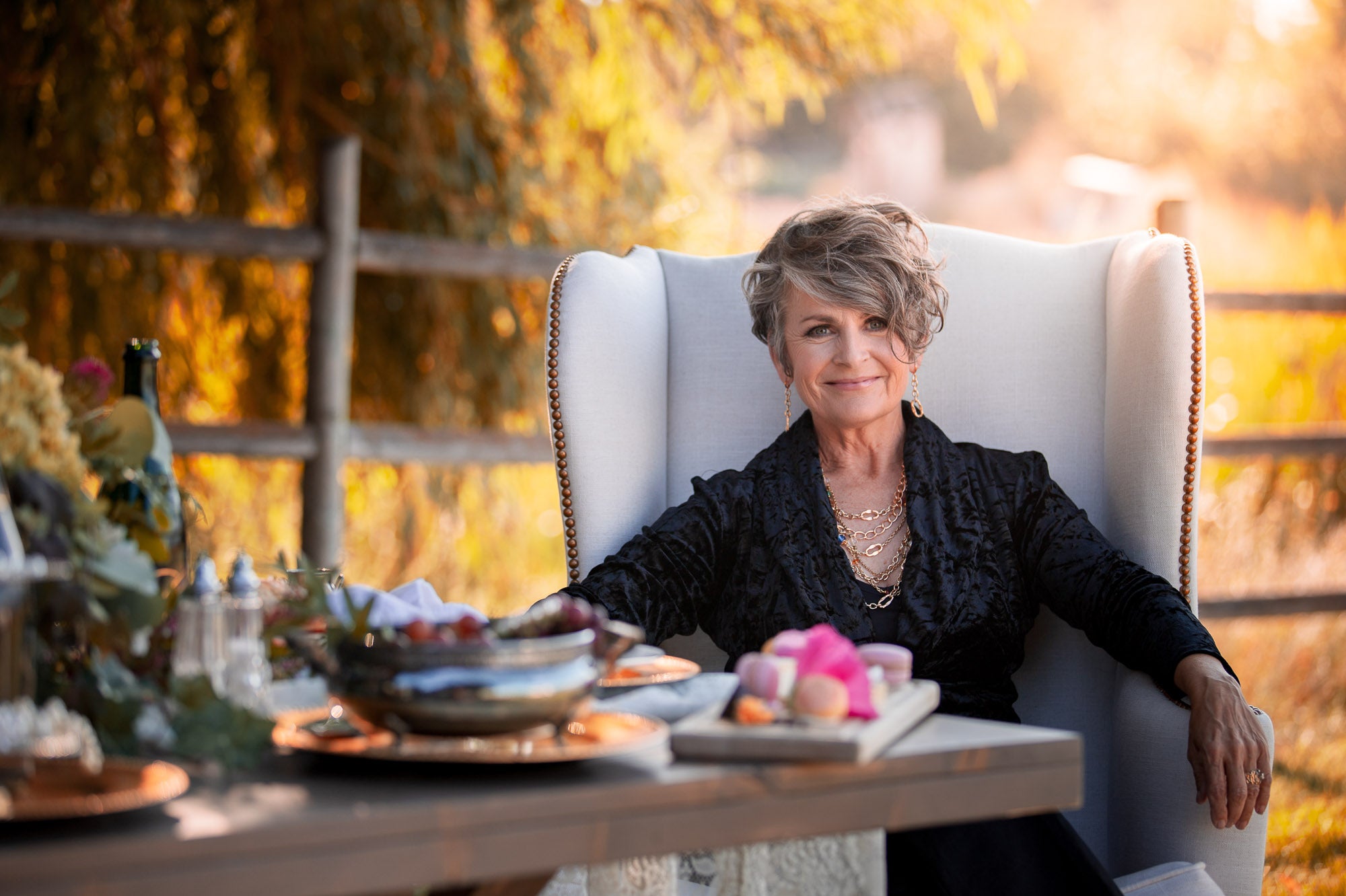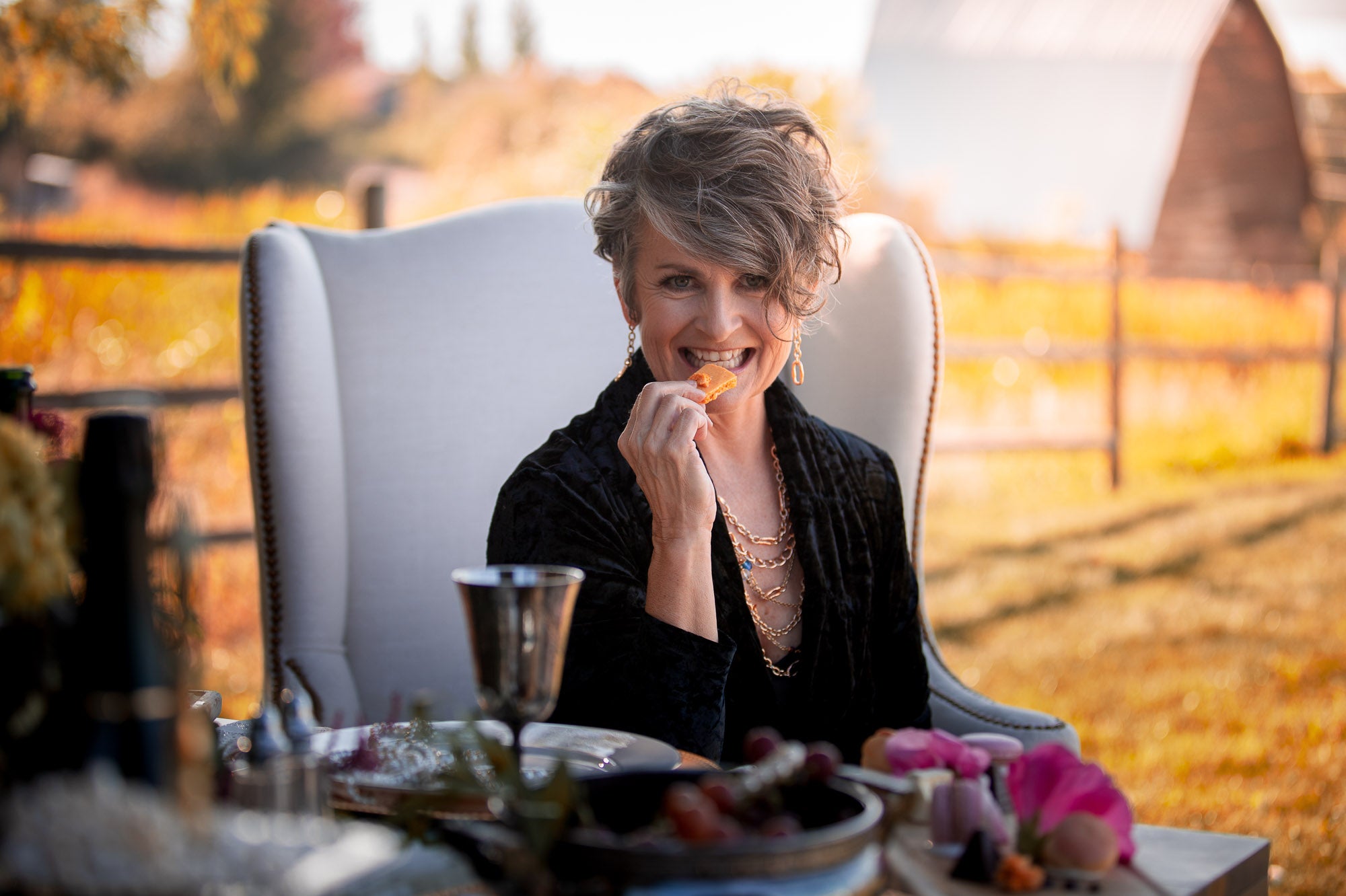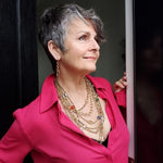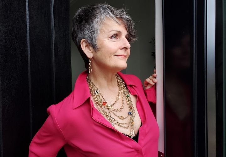 a woman in a black velvet blazer wearing a Carolily Statement necklace made of gold plated chain, various gemstones and freshwater pearls